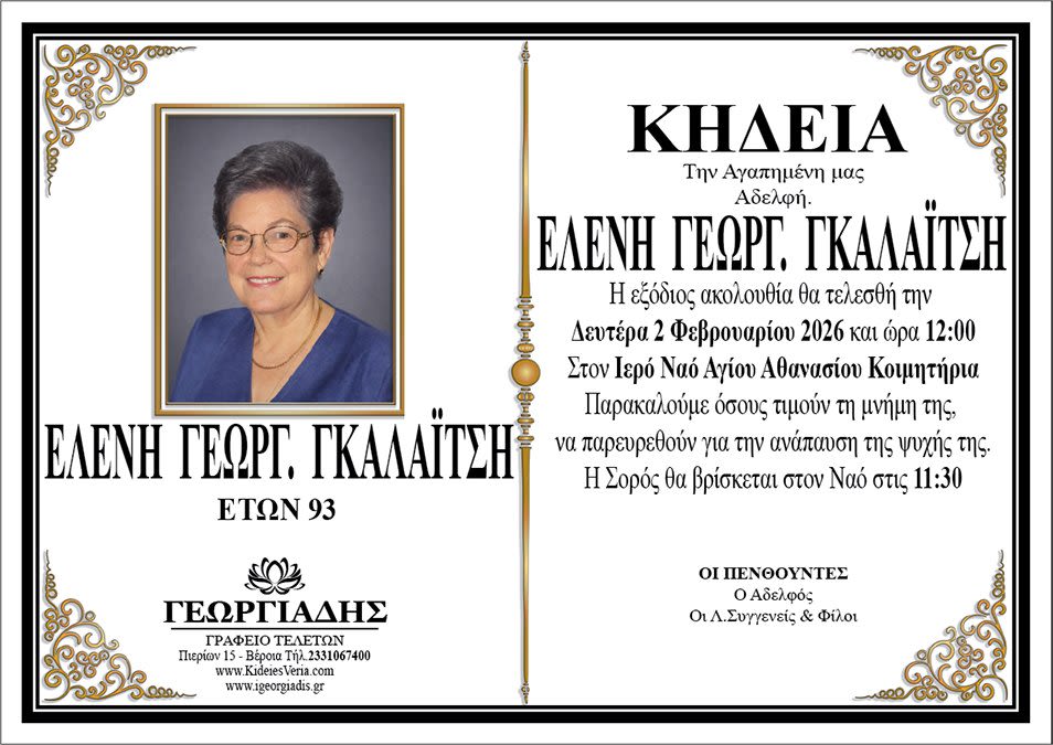 Έφυγε από τη ζωή και κηδεύεται την Δευτέρα 2 Φεβρουαρίου 2026 στις 12.00 μ.μ. από τον Ιερό Ναό Αγίου Αθανασίου (Κοιμητήρια) Βέροιας η Ελένη Γεωργ. Γκαλαϊτση σε ηλικία 93 ετών.