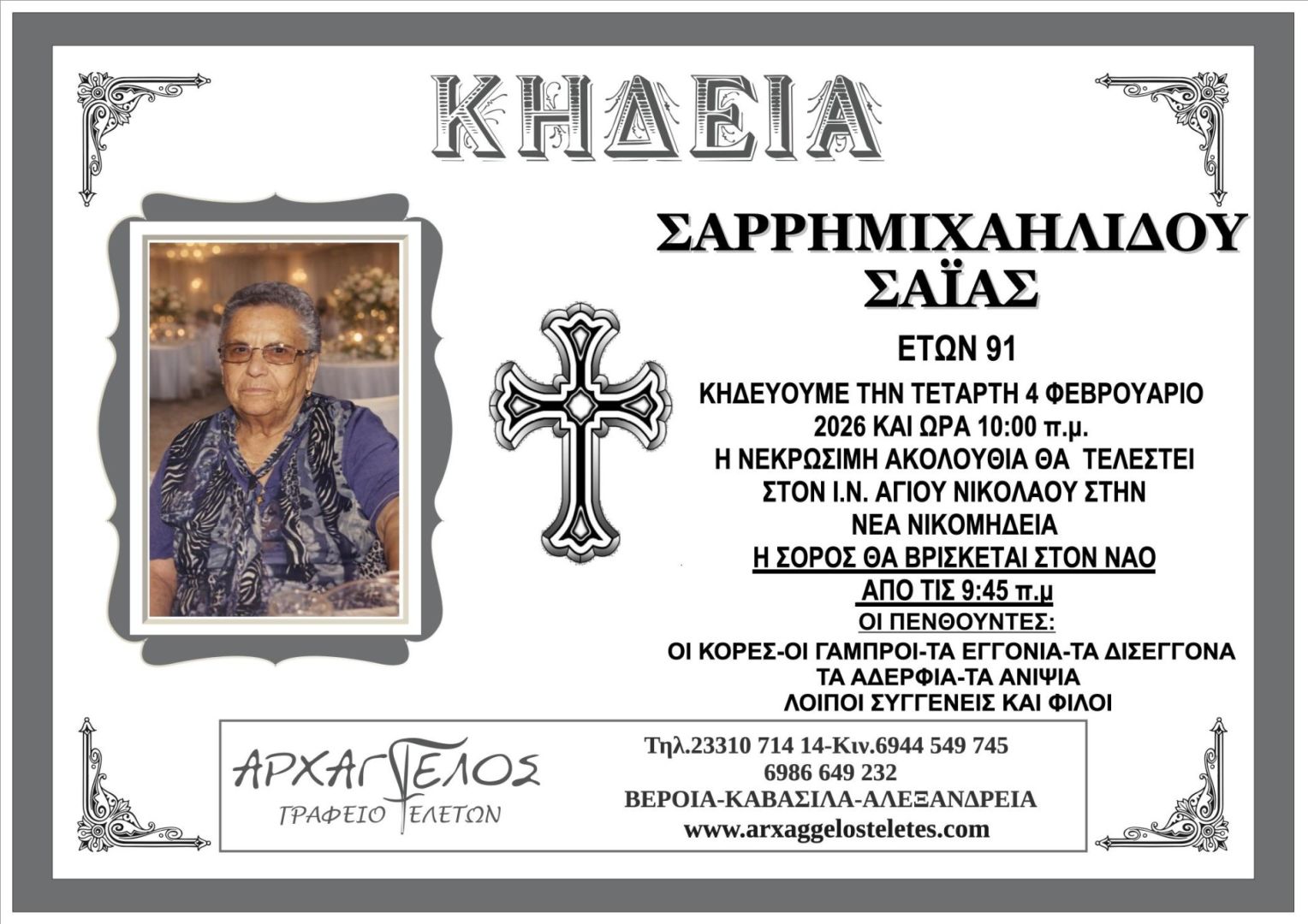 Έφυγε από τη ζωή και κηδεύτηκε σήμερα Τετάρτη 4 Φεβρουαρίου 2026 στις 10.00 π.μ. από τον Ιερό Ναό Αγίου Νικολάου στη Νέα Νικομήδεια η Σαΐα Σαρρημιχαηλίδου σε ηλικία 91 ετών.