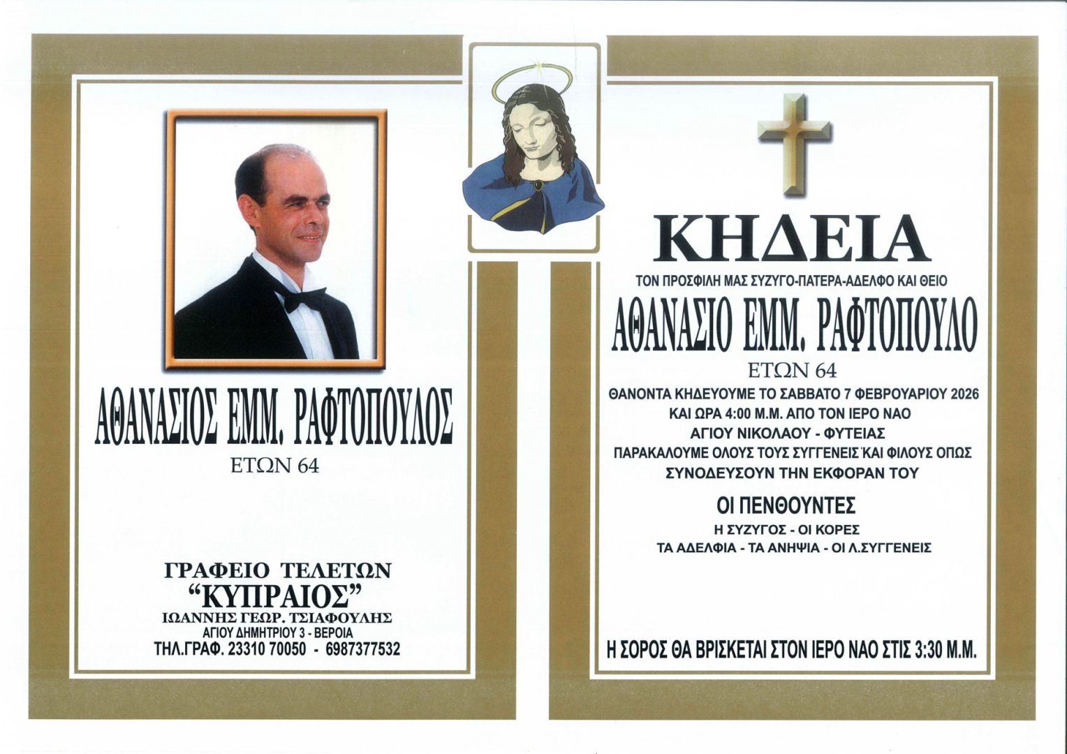 Έφυγε από τη ζωή και κηδεύεται το Σάββατο 7 Φεβρουαρίου 2026 στις 4.00 μ.μ. από τον Ιερό Ναό Αγίου Νικολάου Φυτειάς ο Αθανάσιος Εμμ. Ραφτόπουλος σε ηλικία 64 ετών.