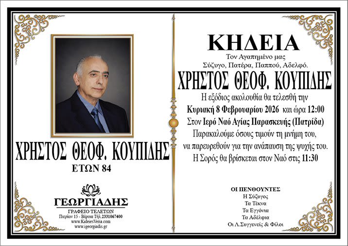 Έφυγε από τη ζωή και κηδεύεται την Κυριακή 8 Φεβρουαρίου 2026 στις 12.00 μ.μ. από τον Ιερό Ναό Αγίας Παρασκευής Πατρίδας ο Χρήστος Θεοφ. Κουπίδης σε ηλικία 84 ετών.
