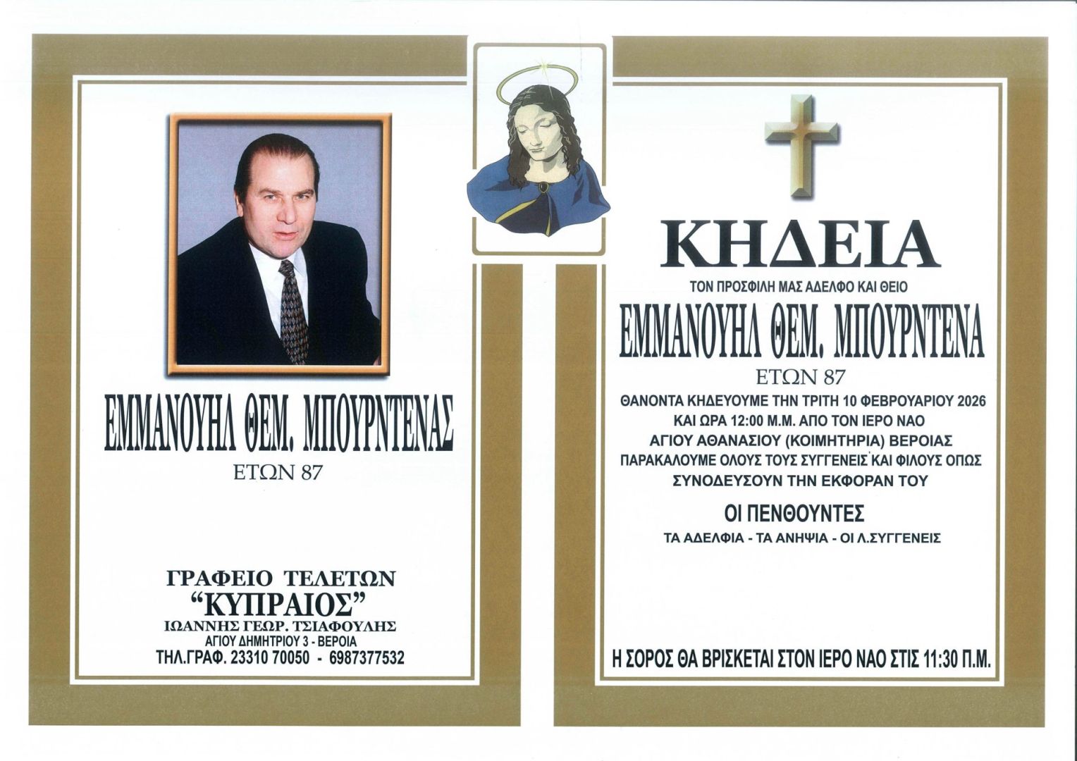 Έφυγε από τη ζωή και κηδεύεται την Τρίτη 10 Φεβρουαρίου 2026 στις 12.00 μ.μ. από τον Ιερό Ναό Αγίου Αθανασίου (Κοιμητήρια) Βέροιας ο Εμμανουήλ Θεμ. Μπουρντένας σε ηλικία 87 ετών.