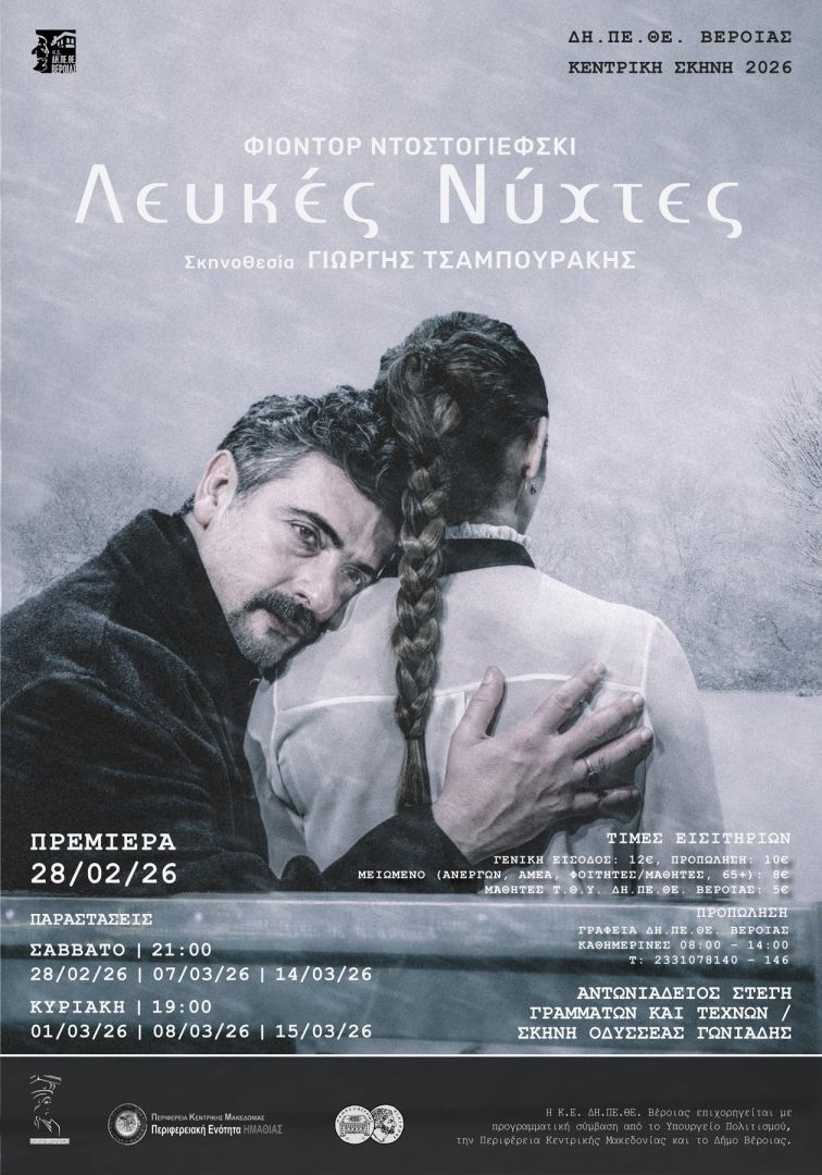 Τις «Λευκές Νύχτες» του Φιοντόρ Ντοστογιέφσκι, ανεβάζει η Κεντρικής Σκηνή του ΔΗΠΕΘΕ Βέροιας, σε σκηνοθεσία και ερμηνεία Γιωργή Τσαμπουράκη. Η πρεμιέρα θα γίνει το Σάββατο 28 Φεβρουαρίου στις 9 μ.μ. στην Αντωνιάδεια Στέγη Γραμμάτων και Τεχνών - Σκηνή Οδυσσέας Γωνιάδης.