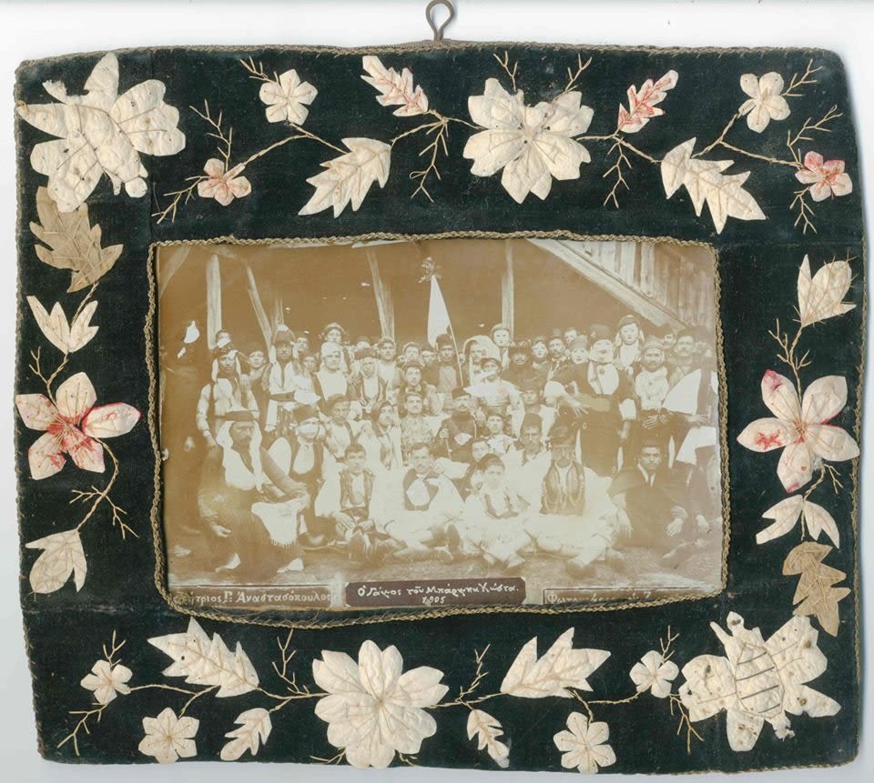 Η φωτογραφία βρίσκεται στη κέντρο ενός «κάδρου» που αποτελείται από πολυτελές ύφασμα τεντωμένο σε συρμάτινο πλαίσιο, είναι κεντημένο με περίγραμμα και εσωτερικό πλαίσιο από στριφτό αλυσοειδές αργυρόνημα, ενώ είναι διακοσμημένο με κεντήματα από κλωστές σε σχήματα μίσχων και κλαδιών που στα άκρα τους φέρουν επίρραφα τεμάχια κουκουλιών κομμένα σε σχήματα φύλλων, ανθέων, πεταλούδων, κάποια από τα οποία ήταν βαμμένα κόκκινα.