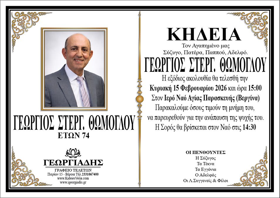 Έφυγε από τη ζωή και κηδεύεται την Κυριακή 15 Φεβρουαρίου 2026 στις 3.00 μ.μ. από τον Ιερό Ναό Αγίας Παρασκευής στην Βεργίνα ο Γεώργιος Στεργ. Θώμογλου σε ηλικία 74 ετών.