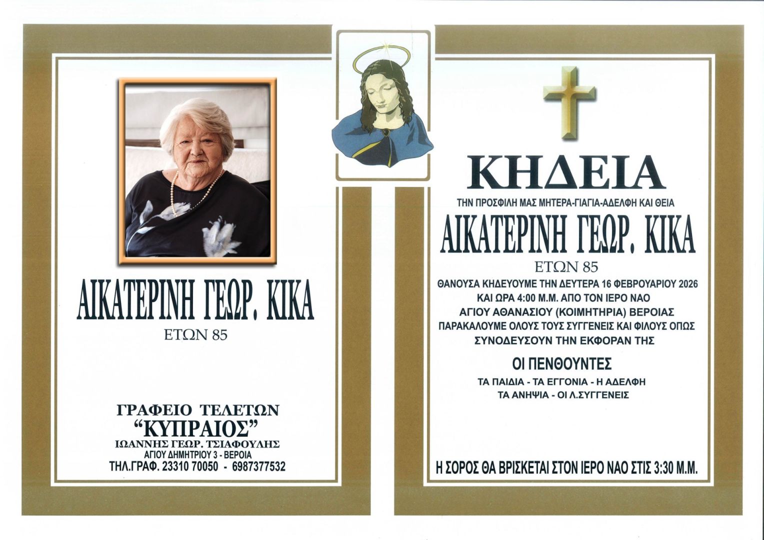 Έφυγε από τη ζωή και κηδεύεται την Δευτέρα 16 Φεβρουαρίου 2026 στις 4.00 μ.μ. από τον Ιερό Ναό Αγίου Αθανασίου (Κοιμητήρια) Βέροιας η Αικατερίνη Γεωρ. Κίκα σε ηλικία 85 ετών.