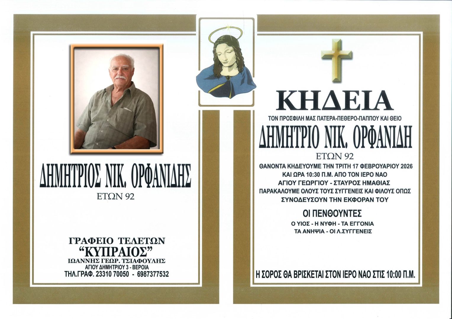 Έφυγε από τη ζωή και κηδεύεται την Τρίτη 17 Φεβρουαρίου 2026 στις 10.30 π.μ. από τον Ιερό Ναό Αγίου Γεωργίου στο Σταυρό Ημαθίας ο Δημήτριος Νικ. Ορφανίδης σε ηλικία 92 ετών.