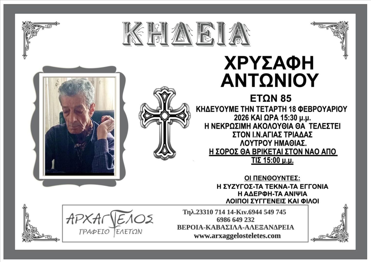 Έφυγε από τη ζωή και κηδεύεται την Τετάρτη 18 Φεβρουαρίου 2026 στις 3.30 μ.μ. από τον Ιερό Ναό Αγίας Τριάδας Λουτρού Ημαθίας ο Αντώνιος Χρυσάφης σε ηλικία 85 ετών.