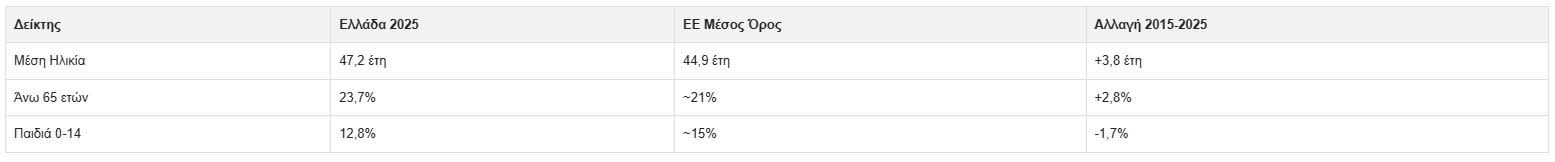 Γερνάει ο πληθυσμός της Ελλάδας, σύμφωνα με έκθεση της Eurostat. Μέσα σε μια δεκαετία η μέση ηλικία των εν ζωή ανθρώπων, αυξήθηκε κατά 3,8 χρόνια, φτάνοντας τα 47,2 έτη. Την 1η Ιανουαρίου 2025, η μέση ηλικία του πληθυσμού της Ευρωπαϊκής Ένωσης (ΕΕ) έφτασε τα 44,9 έτη. Αυτό σημαίνει ότι το ήμισυ του πληθυσμού της ΕΕ ήταν άνω των 44,9 ετών, ενώ το άλλο ήμισυ ήταν νεότερο. Σε ολόκληρη την ΕΕ, η μέση ηλικία κυμαινόταν από 39,6 έτη στην Ιρλανδία έως 49,1 έτη στην Ιταλία. Σε επίπεδο ΕΕ, η μέση ηλικία αυξήθηκε κατά 2,1 έτη από το 2015, όταν ήταν 42,8 έτη. Αύξηση καταγράφηκε σε όλες τις χώρες της ΕΕ, εκτός από τη Γερμανία και τη Μάλτα (-0,4 έτη η καθεμία).