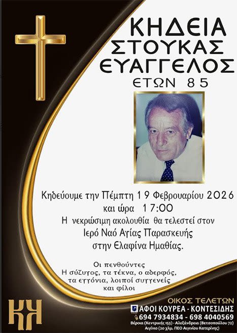 Έφυγε από τη ζωή και κηδεύεται την Πέμπτη 19 Φεβρουαρίου 2026 στις 5.00 μ.μ. από τον Ιερό Ναό Αγίας Παρασκευής στην Ελαφίνα Ημαθίας ο Ευάγγελος Στούκας σε ηλικία 85 ετών.