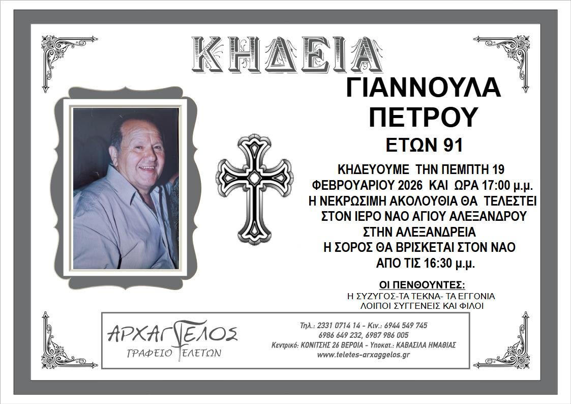 Έφυγε από τη ζωή και κηδεύεται την Πέμπτη 19 Φεβρουαρίου 2026 στις 5.00 μ.μ. από τον Ιερό Ναό Αγίου Αλεξάνδρου στην Αλεξάνδρεια ο Πέτρος Γιαννούλας σε ηλικία 91 ετών.