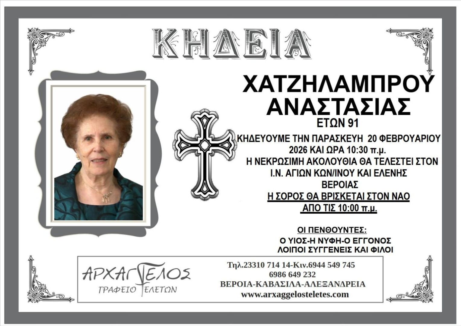 Έφυγε από τη ζωή και κηδεύεται την Παρασκευή 20 Φεβρουαρίου 2026 στις 10.30 π.μ. από τον Ιερό Ναό Αγίων Κων/νου και Ελένης Βέροιας η Αναστασία Χατζηλάμπρου σε ηλικία 91 ετών.