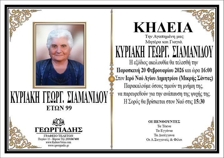Έφυγε από τη ζωή και κηδεύτηκε σήμερα Παρασκευή 20 Φεβρουαρίου 2026 στις 4.00 μ.μ. από τον Ιερό Ναό Αγίου Δημητρίου Μικρής Σάντας η Κυριακή Γεωργ. Σιαμανίδου σε ηλικία 99 ετών.