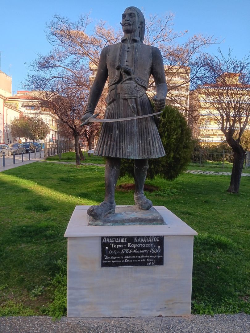 Εικ. 2: Ο ορειχάλκινος ανδριάντας του Καρατάσου, έναντι του Ι. Ν. Αγίων Αναργύρων, έργο της γλύπτριας Αλίκης Χατζή. Είναι προσφορά του Υπουργείου Άμυνας προς τον Δήμο Βέροιας. Τα αποκαλυπτήρια έγιναν την 1η Μαΐου 1970.