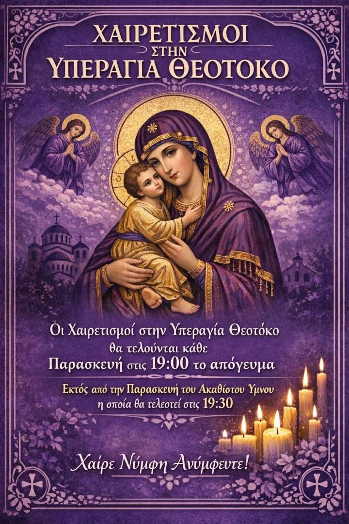 Γνωστοποιείται ότι στον Ιερό Ναό Αγίας Ειρήνης Χρυσοβαλάντου & Οσίου Συμεών του Θεοδόχου Αγίας Τριάδας Ημαθίας, από την επόμενη Παρασκευή, 27 Φεβρουαρίου 2026 και κάθε Παρασκευή, στις 7 το απόγευμα, κατά την περίοδο της Αγίας και Μεγάλης Τεσσαρακοστής, τελούνται οι Ακολουθίες των Χαιρετισμών στην Υπεραγία Θεοτόκο.