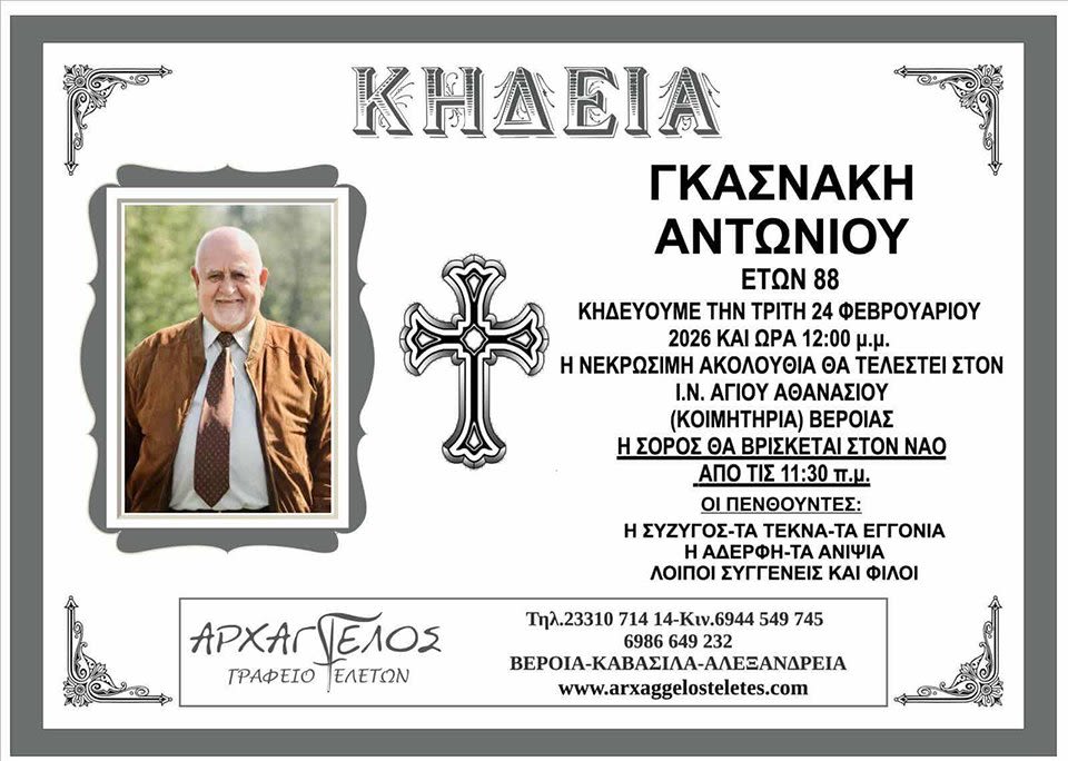 Έφυγε από τη ζωή και κηδεύεται την Τρίτη 24 Φεβρουαρίου 2026 στις 12.00 μ.μ. από τον Ιερό Ναό Αγίου Αθανασίου (Κοιμητήρια) Βέροιας ο Αντώνιος Γκασνάκης σε ηλικία 88 ετών.