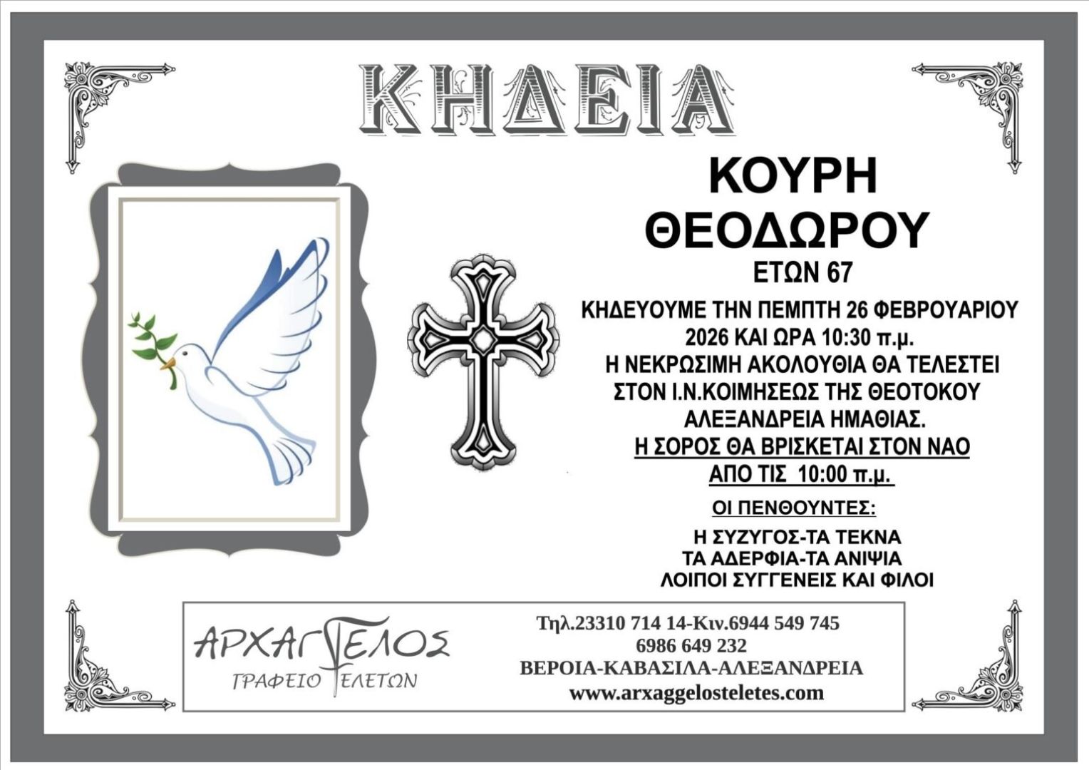 Έφυγε από τη ζωή και κηδεύεται την Πέμπτη 26 Φεβρουαρίου 2026 στις 10.30 π.μ. από τον Ιερό Ναό Κοιμήσεως της Θεοτόκου στην Αλεξάνδρεια Ημαθίας ο Θεόδωρος Κουρής σε ηλικία 67 ετών.