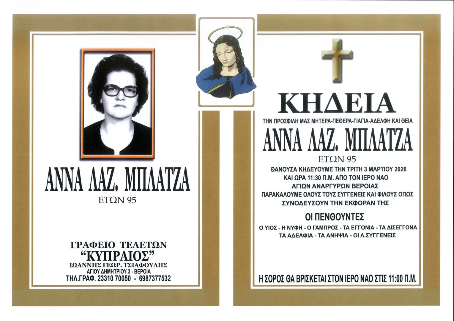 Έφυγε από τη ζωή και κηδεύεται την Τρίτη 3 Μαρτίου 2026 στις 11.30 π.μ. από τον Ιερό Ναό Αγίων Αναργύρων Βέροιας η Άννα Λαζ. Μπλατζα σε ηλικία 95 ετών.