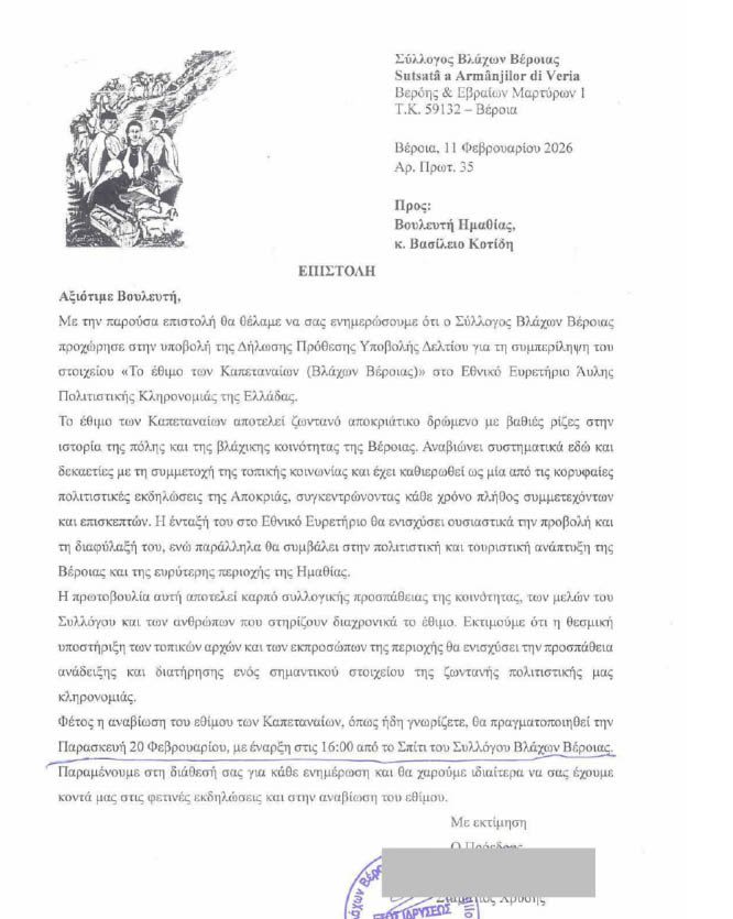 Ο Σύλλογος Βλάχων Βέροιας (οδός Βερόης και Εβραίων Μαρτύρων 1) μας απέστειλε την από 11 Φεβρουαρίου 2026 επιστολή για να μας ενημερώσει ότι προχώρησε στην κατάθεση Δήλωσης Πρόθεσης Υποβολής Δελτίου για την συμπερίληψη του στοιχείου «Το έθιμο των Καπεταναίων (Βλάχων Βέροιας)» στο Εθνικό Ευρετήριο Άυλης Πολιτιστικής Κληρονομιάς της Ελλάδας. Ένα έθιμο που έχει βαθιές πολιτιστικές ρίζες στην ιστορία της πόλης και της βλάχικης κοινότητας της Βέροιας. Σκοπός της ένταξής του στο Εθνικό Ευρετήριο είναι η ενίσχυση της προβολής του και η διαφύλαξή του, εφόσον δύναται να συμβάλλει στην πολιτιστική και τουριστική ανάπτυξη της πόλης της Βέροιας, αλλά και της ευρύτερης περιοχής της Ημαθίας. Θεωρούμε πολύ σημαντική την διατήρηση ζωντανής της πολιτιστικής κληρονομιάς του τόπου μας. Με την παρούσα σας διαβιβάζουμε την εν λόγω επιστολή του Συλλόγου Βλάχων Βέροιας στην οποία αναφέρεται η σχετική πρωτοβουλία που αποτελεί καρπό συλλογικής προσπάθειας των μελών του.