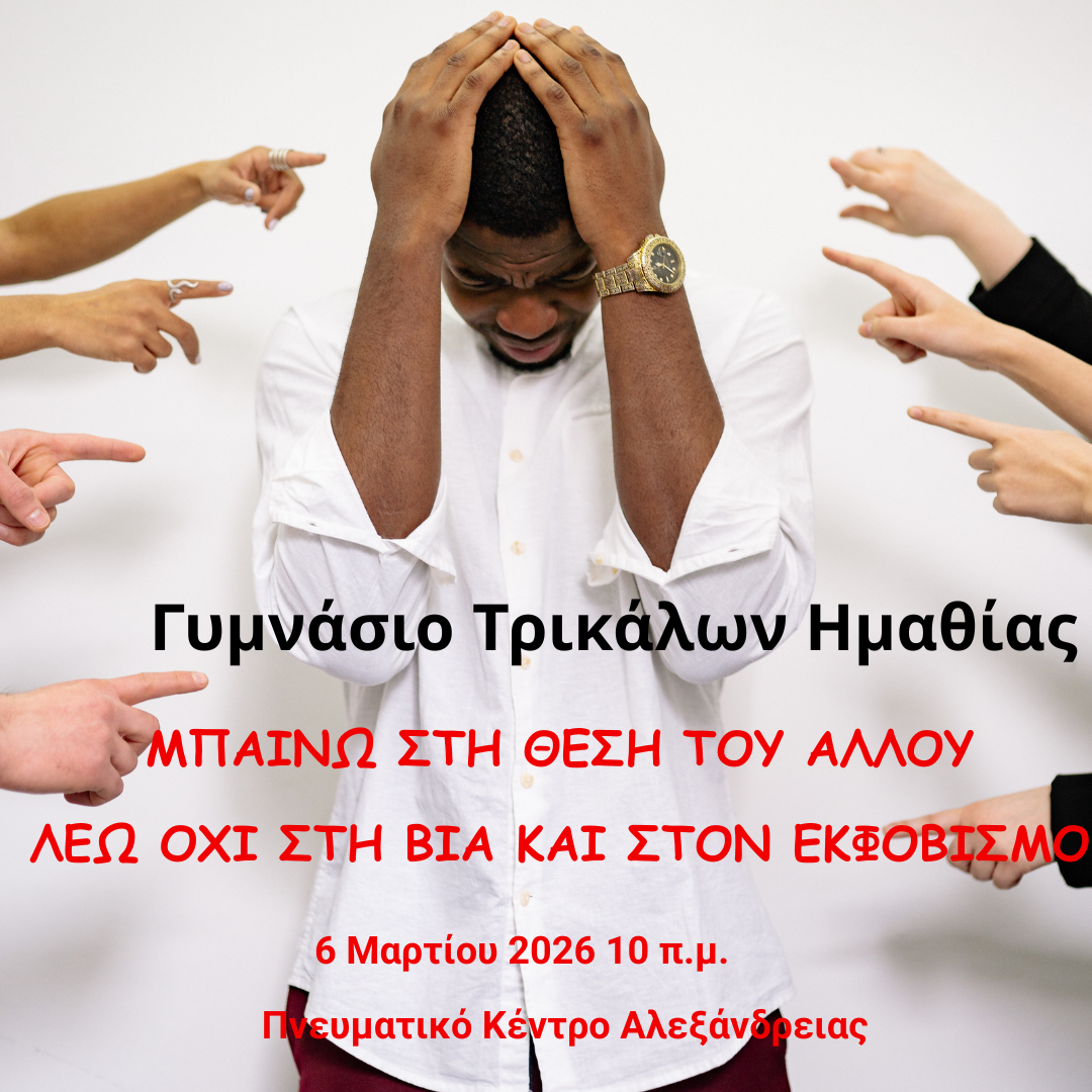 Το Γυμνάσιο Τρικάλων Ημαθίας για τρίτη συνεχή χρονιά σε συνεργασία με το Δίκτυο Σχολείων Σχολικής Διαμεσολάβησης του Παιδαγωγικού Τμήματος Νηπιαγωγών του Πανεπιστημίου Ιωαννίνων, τη Διεύθυνση Δευτεροβάθμιας Εκπαίδευσης Ημαθίας και τον Δήμο Αλεξάνδρειας και υπό την αιγίδα του Υπουργείου Παιδείας, Θρησκευμάτων και Αθλητισμού διοργανώνει δράση ευαισθητοποίησης αφιερωμένη στην Ημέρα κατά της Σχολικής Βίας και του Εκφοβισμού με τίτλο «Μπαίνω στη θέση του άλλου και λέω όχι στη βία και στον εκφοβισμό». Η δράση θα πραγματοποιηθεί την Παρασκευή 6 Μαρτίου 2026, στις 10:00 π.μ. μπροστά στο Πνευματικό Κέντρο Αλεξάνδρειας με τη συμμετοχή σχολείων Α/θμιας και Β/θμιας εκπαίδευσης του Δήμου Αλεξάνδρειας.