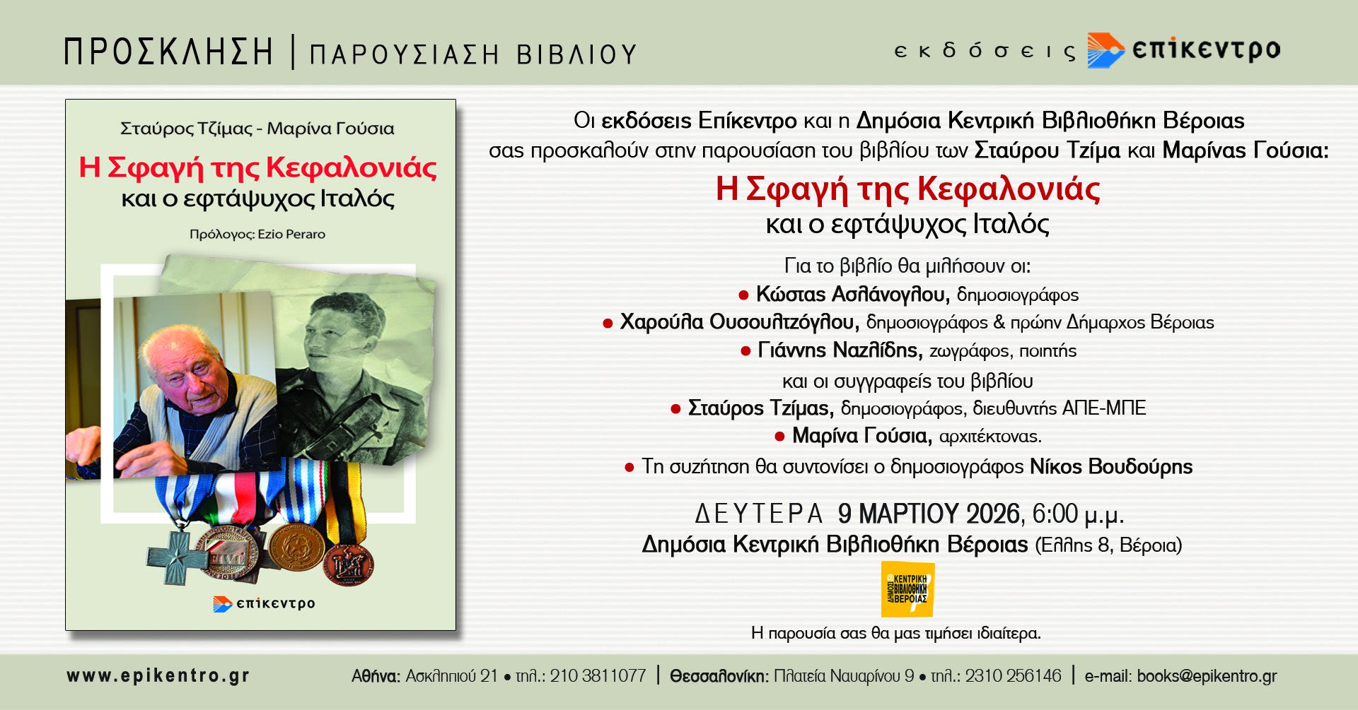 της Κεφαλονιάς και ο εφτάψυχος Ιταλός, στη Δημόσια Κεντρική Βιβλιοθήκη Βέροιας (Έλλης 8, Βέροια).