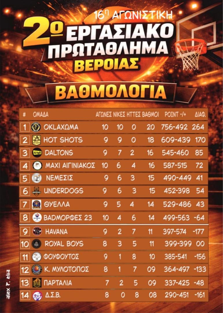 Η 16η αγωνιστική του Εργασιακού τουρνουά Βέροιας, άρχισε με ένα ενδιαφέρον παιχνίδι ανάμεσα στους HotShots και στην ομάδα της ΘΥΕΛΛΑΣ. Με το καλησπέρα η ομάδα της ΘΥΕΛΛΑΣ, έβαλε δύσκολα στους πρωτοπόρους της βαθμολογίας και έδειξε ότι το παιχνίδι θα είναι άκρως ενδιαφέρον!Οι κιτρινόμαυροι άργησαν να βρουν τα πατήματά τους στο γήπεδο, με συνέπεια η Θύελλα όντας πιο συγκεντρωμένη να σκοράρει ορθολογικά και η άμυνά της να γίνεται όλο και πιο συμπαγής. Περνώντας ο χρόνος οι HotShots άρχισαν να συνδυάζονται καλύτερα και αυτό φάνηκε τόσο στο σκορ όσο και στα ριμπάουντ. Καθώς κυλούσε ο χρόνος το παιχνίδι πήγαινε πόντο πόντο αλλά σε κάποιο σημείο η ομάδα των HotShots κατάφερε ν’ αποκτήσει μια μικρή διαφορά.Οι παίκτες της ΘΥΕΛΛΑΣ όμως επανήλθαν δριμύτεροι και με καλάθια έξω από την γραμμή των 6,25 μείωσαν και ισοφάρισαν το σκορ. Αποτέλεσμα όλων των παραπάνω ήταν το παιχνίδι να αποκτήσει ακόμα περισσότερο ενδιαφέρον, οι μάχες των παικτών στο παρκέ να είναι ακόμα πιο αμφίρροπες και το πάθος εντός και εκτός παρκέ να ξεχειλίζει.Καθώς το παιχνίδι τελείωνε και όλοι έβλεπαν την παράταση…Σε δύο φάσεις η άμυνα της ΘΥΕΛΛΑΣ αποσυντονίστηκε με συνέπεια οι HotShots να το εκμεταλλευτουν στο έπακρο και να καταφέρουν να φύγουν νικητές! Άξιοι συγχαρητηρίων και οι δυο διαιτητές που «κράτησαν» το παιχνίδι, επιδεικνύοντας κρίση και ψυχραιμία ταυτόχρονα.