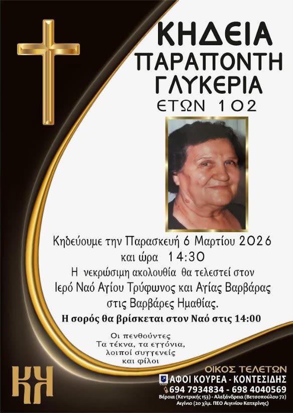 Έφυγε από τη ζωή και κηδεύτηκε σήμερα Παρασκευή 6 Μαρτίου 2026 στις 14.30 μ.μ. από τον Ιερό Ναό Αγίου Τρύφωνος και Αγίας Βαρβάρας στις Βαρβάρες Ημαθίας, η Γλυκερία Παραποντη σε ηλικία 102 ετών.