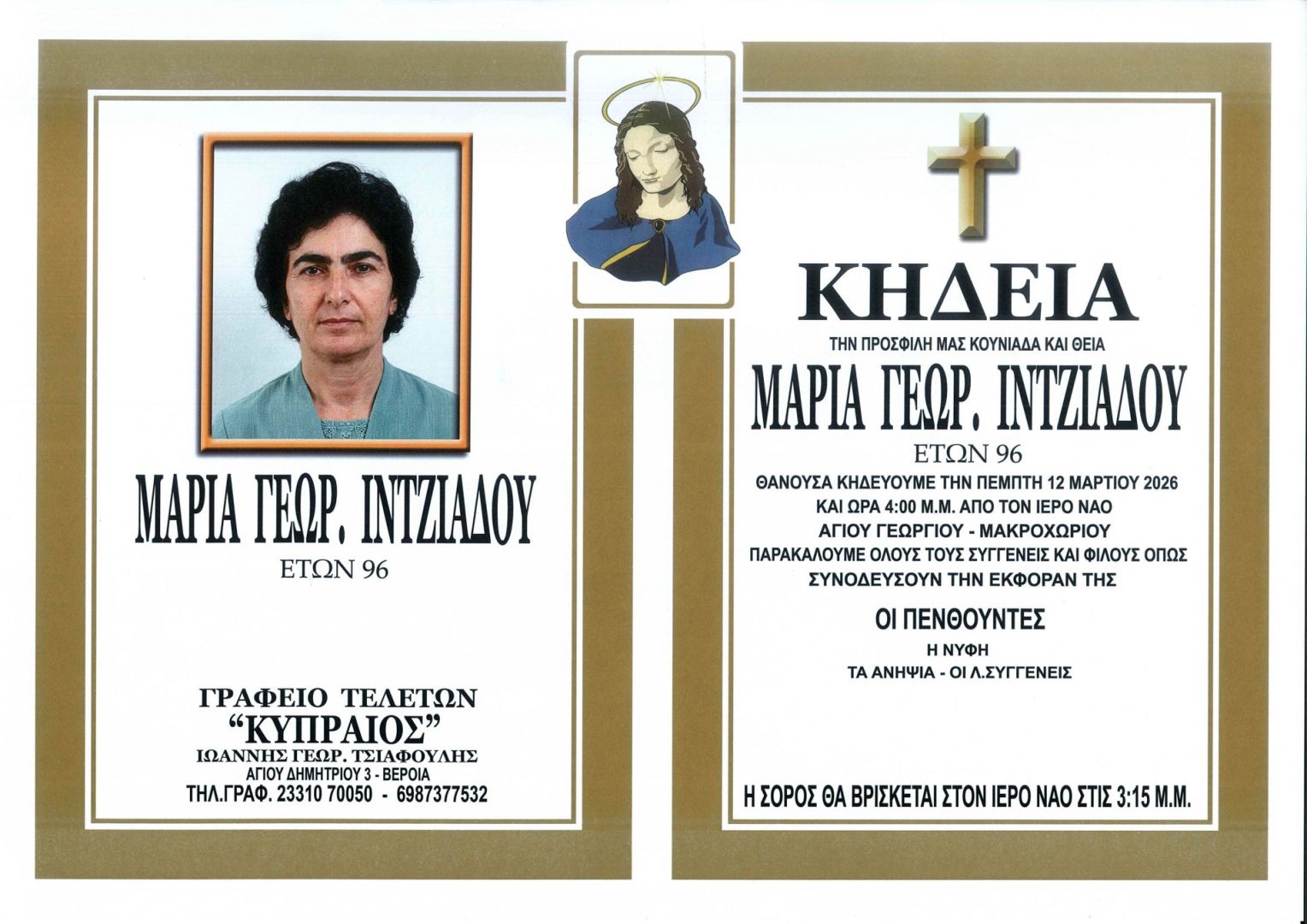 Έφυγε από τη ζωή και κηδεύεται την Πέμπτη 12 Μαρτίου 2026 στις 4.00 μ.μ. από τον Ιερό Ναό Αγίου Γεωργίου Μακροχωρίου η Μαρία Γεωρ. Ιντζιάδου σε ηλικία 96 ετών.