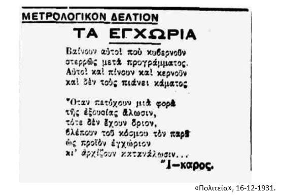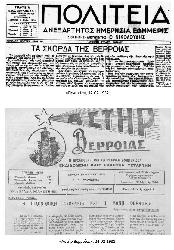 [5] «Ἀστὴρ Βερροίας», 24-02-1932: «Οἰκονομικὴ ἀσθένεια καὶ ἡ μόνη θεραπεία».