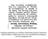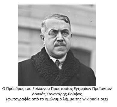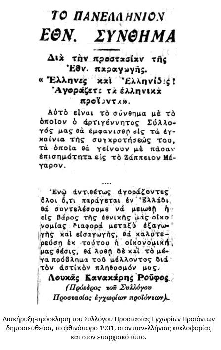1932. «Φτερό στον άνεμο» (ή μάλλον άχυρο στον τυφώνα) της παγκόσμιας οικονομικής κατάρρευσης, η χώρα μας οδηγείται ολοταχώς στην πτώχευση. Μία από τις «ασπιρίνες» με τις οποίες απεγνωσμένα προσπαθεί αν όχι να αποτρέψει τουλάχιστον να καθυστερήσει το μοιραίο η Κυβέρνηση του Ελευθερίου Βενιζέλου, είναι και η ίδρυση του «Συλλόγου Προστασίας Εγχωρίων Προϊόντων», στον οποίο, υπό την προεδρία του Αχαιού τέως βουλευτή και υπουργού Λουκά Κανακάρη-Ρούφου[2], συμμετέχουν πρωταγωνιστικές μορφές του πολιτικού προσκηνίου (: Ελευθέριος Βενιζέλος και ο υιός αυτού Κυριάκος, Γεώργιος Μερκούρης, Ξενοφών Ζολώτας, Γεώργιος Πεσμαζόγλου, Θεμιστοκλής Σοφούλης, κ.α.π.).