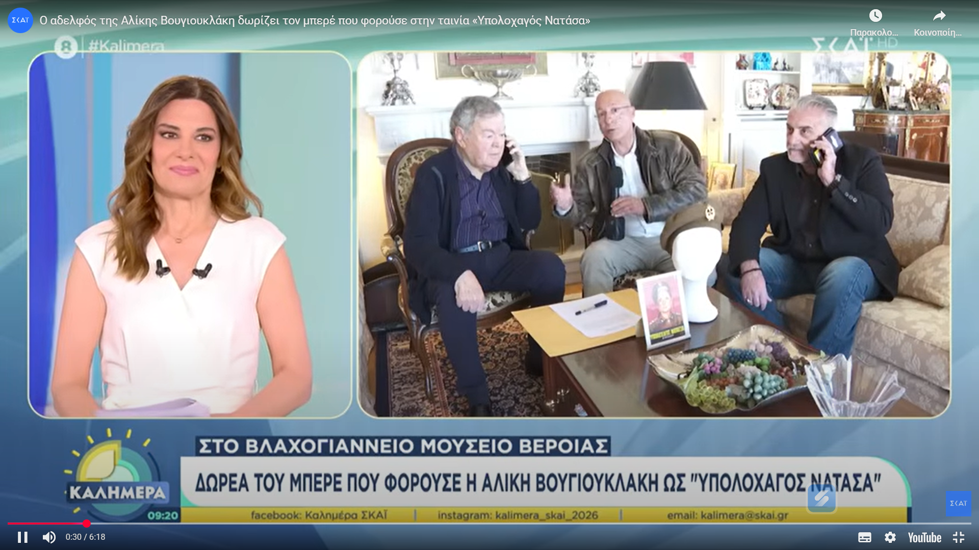 Τον μπερέ που φορούσε η Αλίκη Βουγιουκλάκη στην ταινία «Υπολοχαγός Νατάσα» δώρισε στο Βλαχογιάννειο Μουσείο Βέροιας ο αδελφός της αξέχαστης ηθοποιού, Αντώνης Βουγιουκλάκης. Η υπογραφή της δωρεάς έγινε ζωντανά στην εκπομπή της Φαίης Μαυραγάνη «Καλημέρα» του ΣΚΑΪ, το πρωί του Σαββάτου(14/3/2026), παρόντος του υπεύθυνου του μουσείου, Κανέλλου Ντόντου.