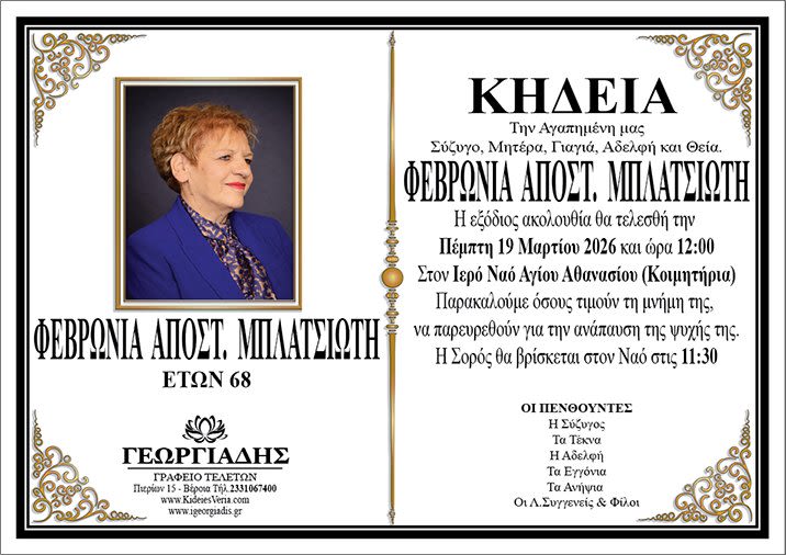 Έφυγε από τη ζωή και κηδεύεται την Πέμπτη 19 Μαρτίου 2026 στις 12.00 από τον Ιερό Ναό Αγίου Αθανασίου (Κοιμητήρια) Βέροιας η Φεβρωνία Αποστ. Μπλατσιώτη σε ηλικία 68 ετών.