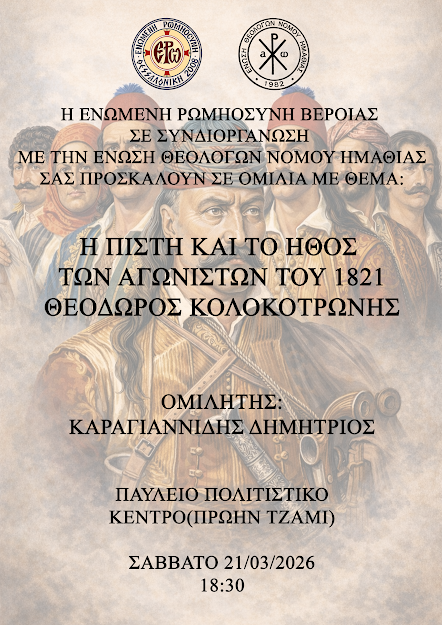 Η Ενωμένη Ρωμηοσύνη Βέροιας σε συνδιοργάνωση με την Ένωση θεολόγων Νομού Ημαθίας σας προσκαλούν σε ομιλία με θέμαː « Η ΠΙΣΤΗ ΚΑΙ ΤΟ ΗΘΟΣ ΤΩΝ ΑΓΩΝΙΣΤΩΝ ΤΟΥ 1821 ΘΕΟΔΩΡΟΣ ΚΟΛΟΚΟΤΡΩΝΗΣ » Ομιλιτής ː ΚΑΡΑΓΙΑΝΝΙΔΗΣ ΔΗΜΗΤΡΙΟΣ εκπαιδευτικός . Η ομιλία θα γίνει στο Παύλειο πολιτιστικό κέντρο ( πρώην τζαμί) το Σάββατο 21/03/2026 ώρα 18,30