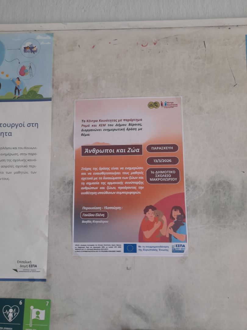 Στο πλαίσιο των δράσεων ενημέρωσης και ευαισθητοποίησης, ο Δήμος Βέροιας, μέσω του Κέντρου Κοινότητας με Παράρτημα Ρομά και Κέντρο Ένταξης Μεταναστών (ΚΕΜ), πραγματοποίησε την Παρασκευή 13 Μαρτίου 2026, στοχευμένη ενημερωτική παρέμβαση στους μαθητές της Γ’ Τάξης του 1ου Δημοτικού Σχολείου Μακροχωρίου.