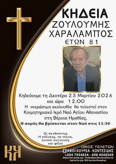 Έφυγε από τη ζωή και κηδεύεται αύριο Δευτέρα 23 Μαρτίου 2026 στις 12.00 μ.μ. από τον Ιερό Ναό Αγίου Αθανασίου (Κοιμητήρια) Βέροιας, ο Χαράλαμπος Ζουλούμης σε ηλικία 81 ετών.