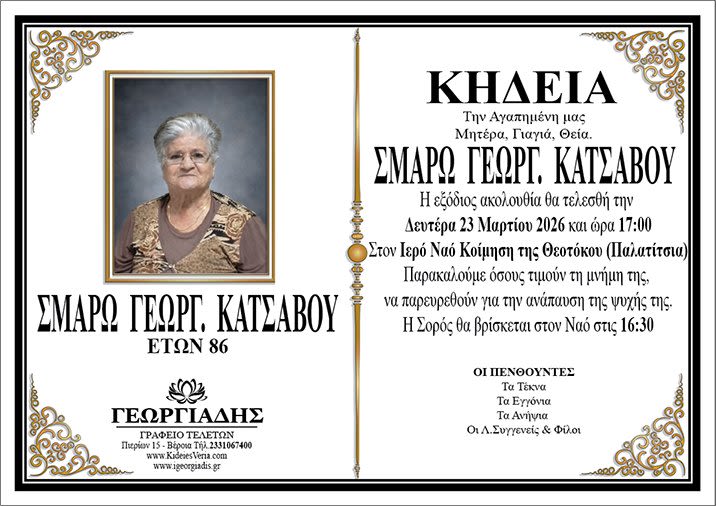 Έφυγε από τη ζωή και κηδεύεται την Δευτέρα 23 Μαρτίου 2026 στις 5.00 μ.μ. από τον Ιερό Ναό Κοίμησης της Θεοτόκου στα Παλατίτσια η Σμαρώ Γεωργ. Κατσαβού σε ηλικία 86 ετών.