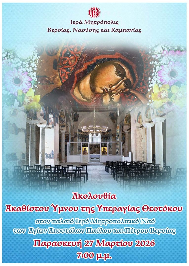 Την Παρασκευή 27 Μαρτίου στις 7:00 μ.μ. στον Παλαιό Ιερό Μητροπολιτικό Ναό των Αγίων Αποστόλων Παύλου και Πέτρου στη Βέροια θα τελεστεί η Ακολουθία του Ακαθίστου Ύμνου προεξάρχοντος του Ποιμενάρχου μας, Σεβασμιωτάτου Μητροπολίτου Βεροίας, Ναούσης και Καμπανίας κ. Παντελεήμονος.