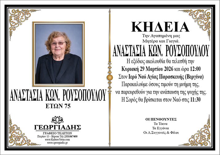 Έφυγε από τη ζωή και κηδεύεται την Κυριακή 29 Μαρτίου 2026 στις 12.00 μ.μ. από τον Ιερό Ναό Αγίας Παρασκευής Βεργίνας η Αναστασία Κων. Ρουσοπούλου σε ηλικία 75 ετών.