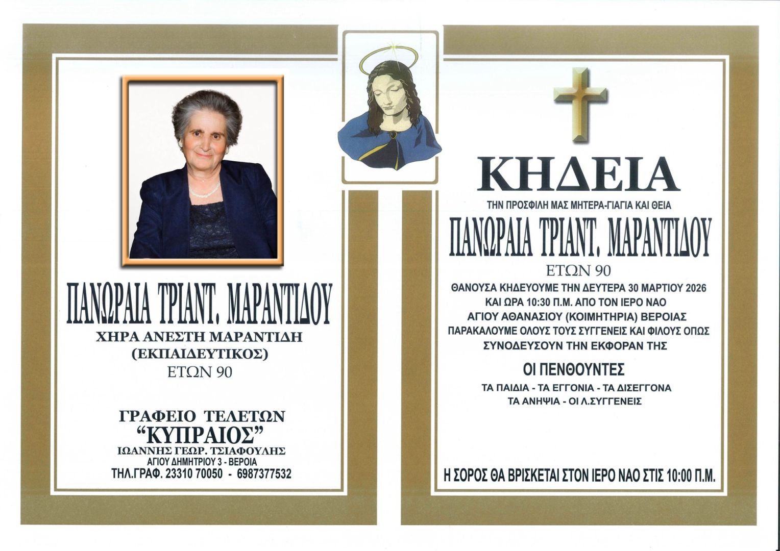 Έφυγε από τη ζωή και κηδεύεται την Δευτέρα 30 Μαρτίου 2026 στις 10.30 π.μ. από τον Ιερό Ναό Αγίου Αθανασίου (Κοιμητήρια) Βέροιας η Πανωραία Τριαντ. Μαραντίδου (χήρα Ανέστη Μαραντίδη) εκπαιδευτικός σε ηλικία 90 ετών.