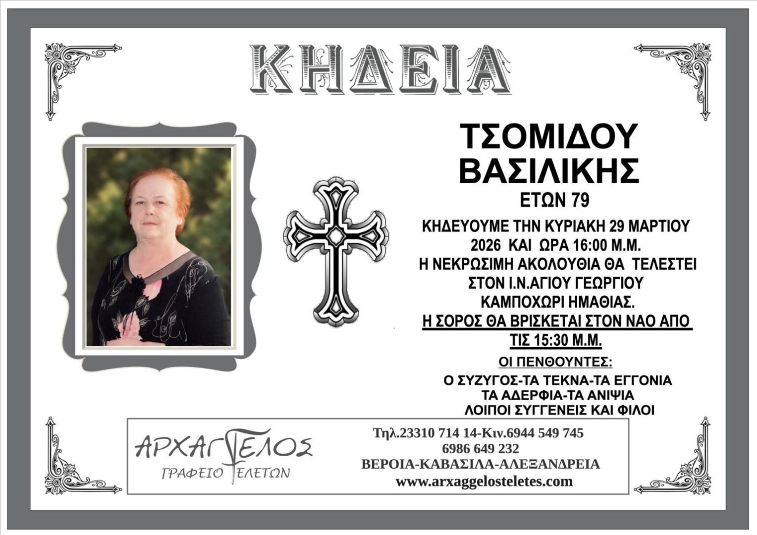 Έφυγε από τη ζωή και κηδεύτηκε την Κυριακή 29 Μαρτίου 2026 στις 4.00 μ.μ. από τον Ιερό Ναό Αγίου Γεωργίου στο Καμποχώρι Ημαθίας η Βασιλική Τσομίδου σε ηλικία 79 ετών.