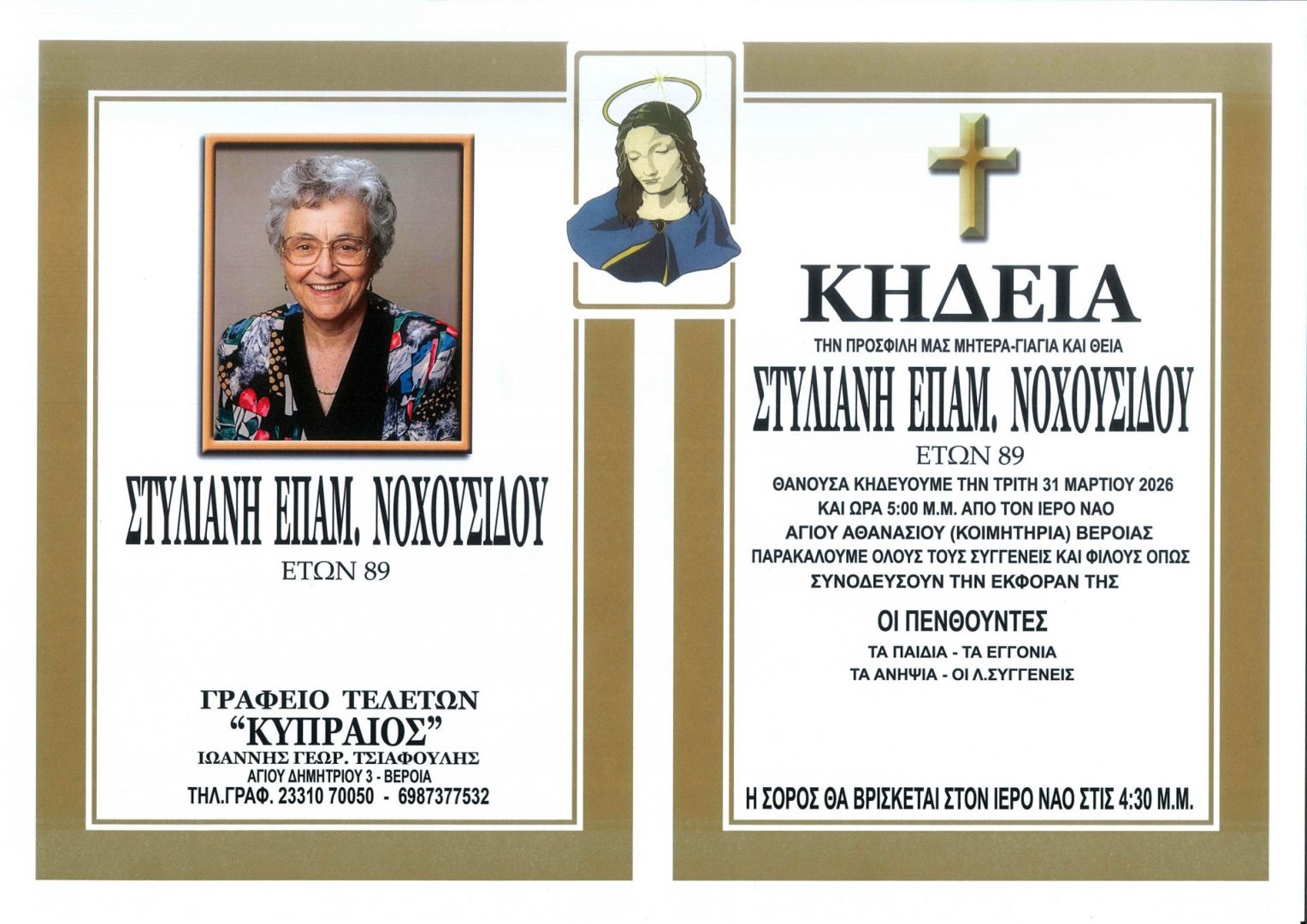 Έφυγε από τη ζωή και κηδεύεται την Τρίτη 31 Μαρτίου 2026 στις 5.00 μ.μ. από τον Ιερό Ναό Αγίου Αθανασίου (Κοιμητήρια) Βέροιας η Στυλιανή Επαμ. Νοχουσίδου σε ηλικία 89 ετών.