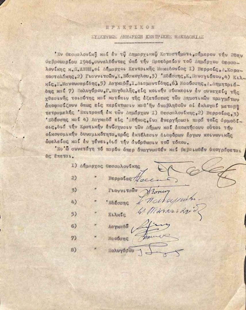 Ἐν Θεσσαλονίκῃ καὶ ἐν τῷ Δημαρχιακῷ Καταστήματι, σήμερον τὴν 28ην Φεβρουαρίου 1946, συνελθόντες ὑπὸ τὴν Προεδρείαν τοῦ Δημάρχου Θεσσαλονίκης κ. Π. Λεβῆ, οἱ Δήμαρχοι Κεντρικῆς Μακεδονίας