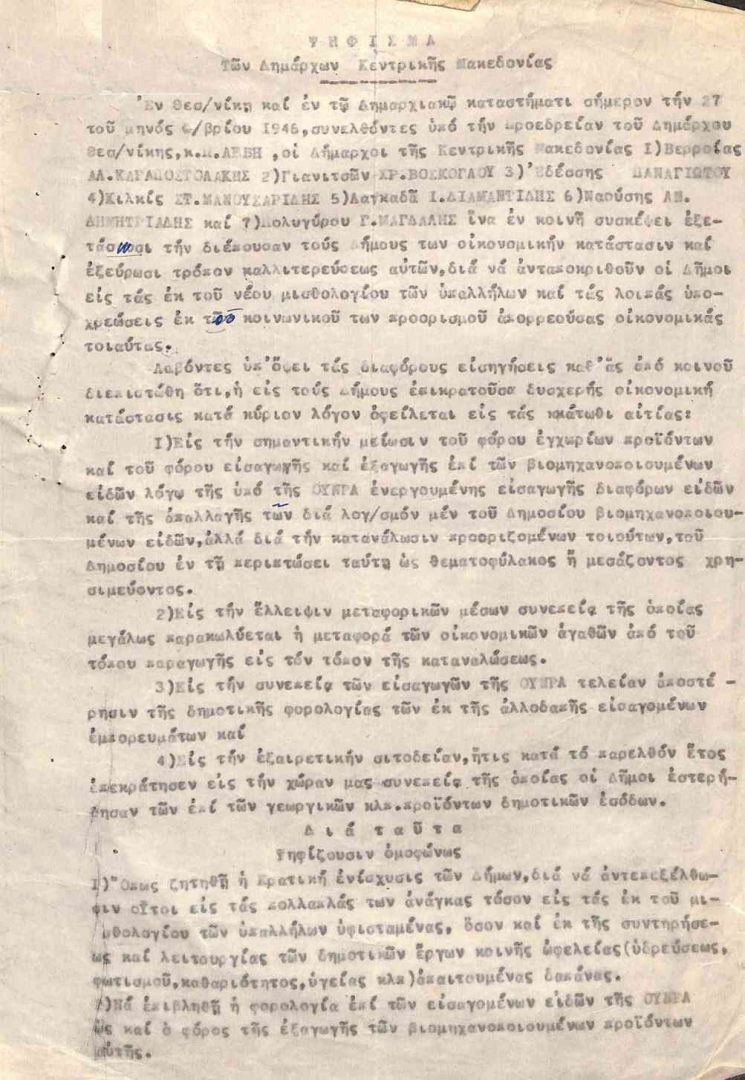 Κατά την διάρκεια της ταραγμένης (και αιματοβαμμένης) προεκλογικής περιόδου, που οδήγησε στις βουλευτικές εκλογές της 31-03-1946[1], συνέρχονται «ἐν κοινῇ συσκέψει», στην Θεσσαλονίκη, οκτώ (από τους, τότε, εννιά) Δήμαρχοι της Κεντρικής Μακεδονίας «ἵνα ἐν κοινῇ συσκέψει ἐξετάσωσι τὴν διέπουσαν τοὺς Δήμους των οἰκονομικὴν κατάστασιν καὶ ἐξεύρωσι τρόπον καλλιτερεύσεως αὐτῶν».