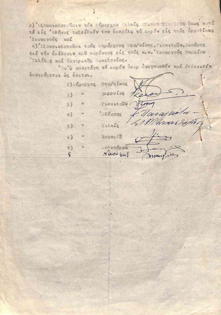 4). Ἐξουσιοδοτοῦσι τοὺς Δημάρχους Θεσ/νίκης, Γιαννιτσῶν, Ναούσης διὰ τὴν ἐπίδοσιν τοῦ παρόντος εἰς τοὺς κ.κ. Ὑπουργούς Βορείου Ἑλλάδος[17] καὶ Κεντρικῆς Μακεδονίας[18].