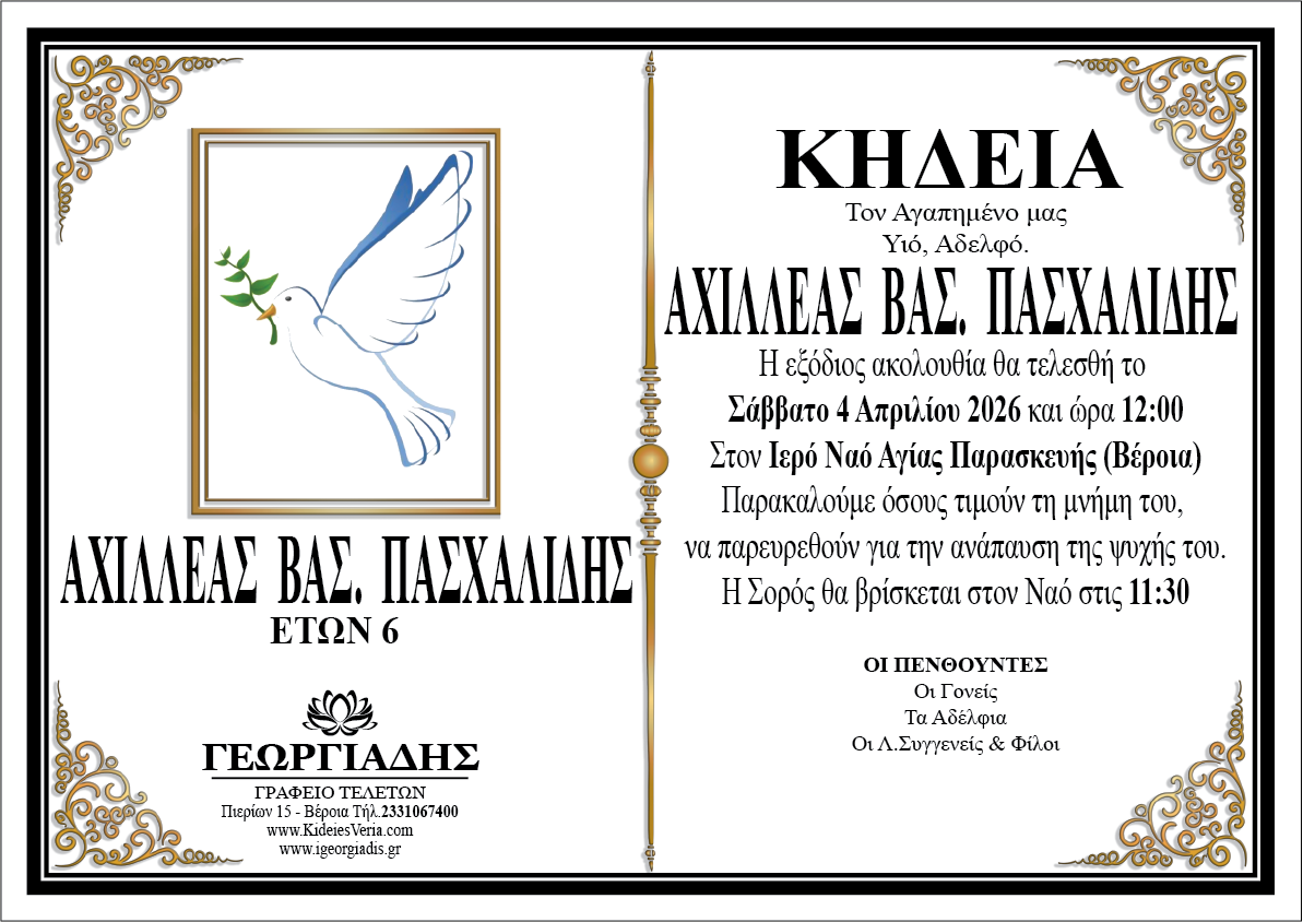 Κηδεύεται το Σάββατο 4 Απριλίου 2026 στις 12.00 από τον Ιερό Ναό Αγίας Παρασκευής Βέροιας ο 6χρονος Αχιλλέας Βασ. Πασχαλίδης.