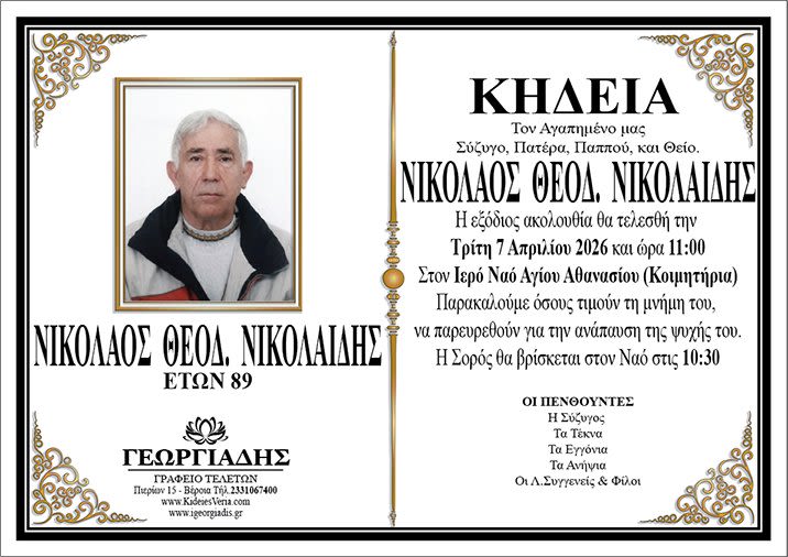 Έφυγε από τη ζωή και κηδεύεται την Μ. Τρίτη 7 Απριλίου 2026 στις 11.00 π.μ. από τον Ιερό Ναό Αγίου Αθανασίου (Κοιμητήρια) Βέροιας ο Νικόλαος Θεοδ. Νικολαϊδης σε ηλικία 89 ετών.
