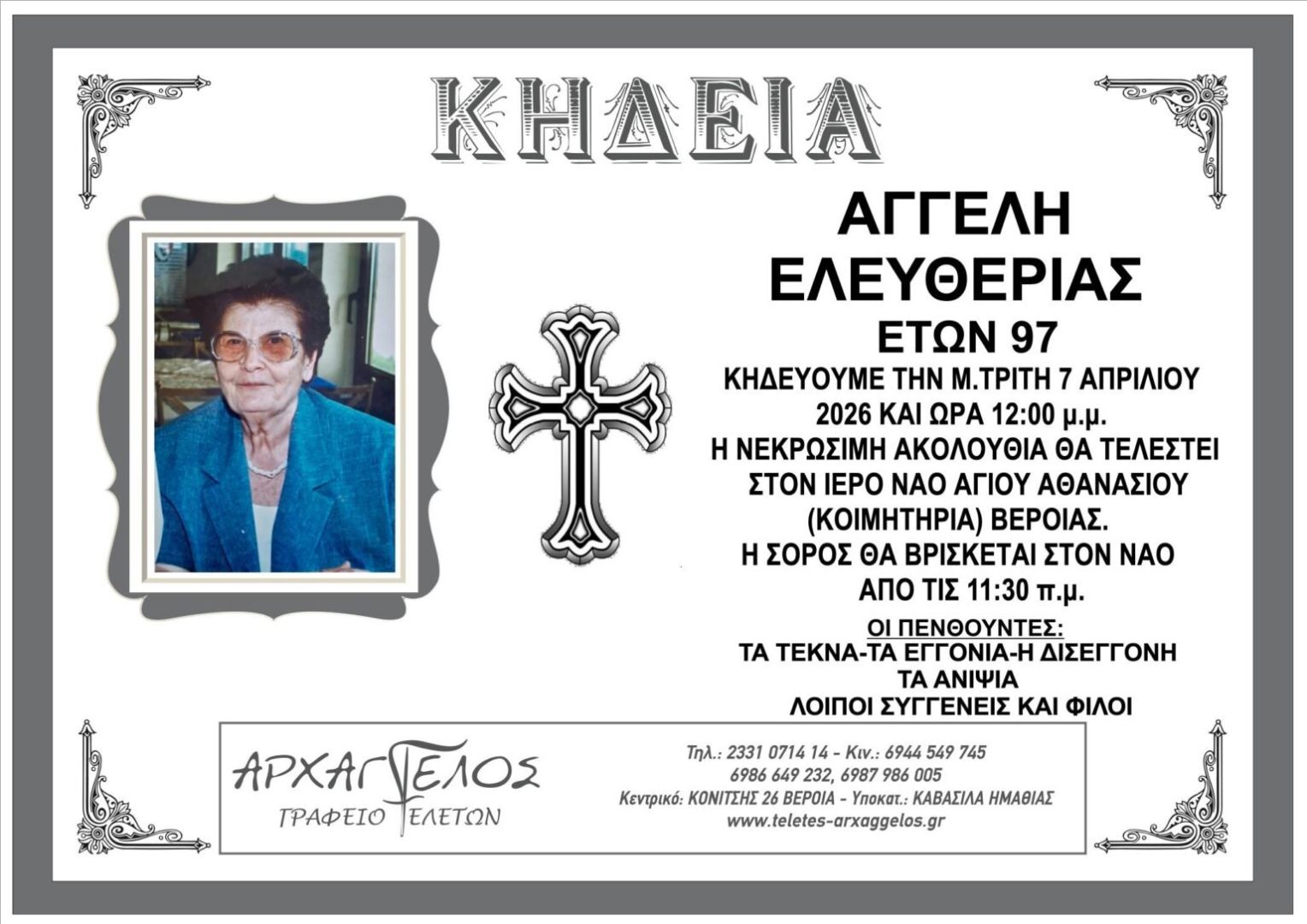 Έφυγε από τη ζωή και κηδεύεται την Μ. Τρίτη 7 Απριλίου 2026 στις 12.00 μ.μ. από τον Ιερό Ναό Αγίου Αθανασίου (Κοιμητήρια) Βέροιας η Ελευθερία Αγγελή σε ηλικία 97 ετών.