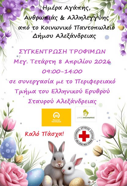 Ο Δήμος Αλεξάνδρειας μέσω του Κοινωνικού Παντοπωλείου της Διεύθυνσης Κοινωνικής Προστασίας Παιδείας και Πολιτισμού του Δήμου Αλεξάνδρειας, σε συνεργασία με το Περιφερειακό Τμήμα του Ελληνικού Ερυθρού Σταυρού, εν όψει των άγιων ημερών του Πάσχα, συνδιοργανώνουν δράση με σκοπό τη συγκέντρωση τροφίμων για τους συμπολίτες μας που στερούνται βασικών ειδών διατροφής με τίτλο “Ημέρα Αγάπης, Ανθρωπιάς και Αλληλεγγύης».
