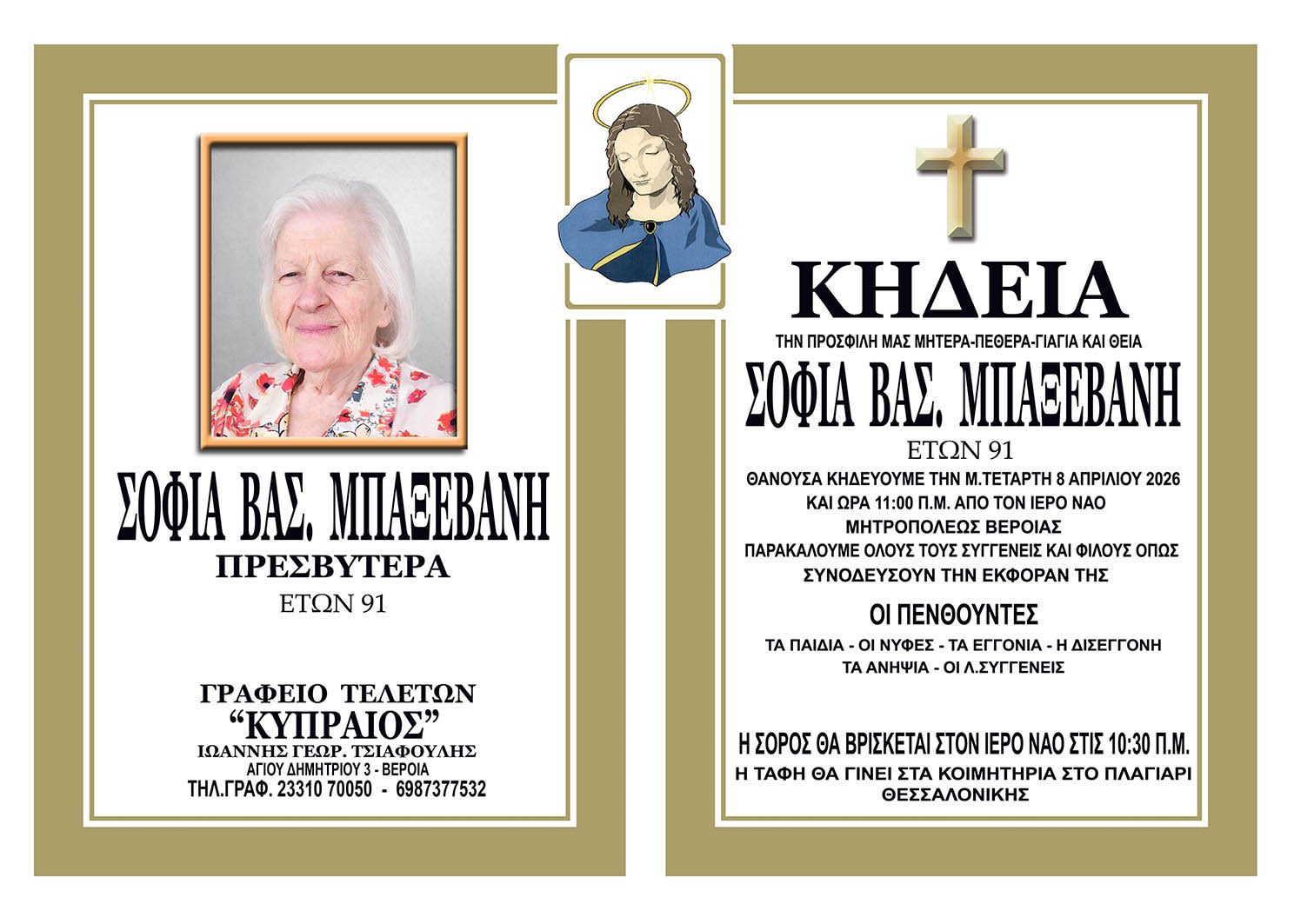 Έφυγε από τη ζωή και κηδεύεται την Μ. Τετάρτη 8 Απριλίου 2026 στις 11.00 π.μ. από τον Ιερό Ναό Μητροπόλεως Βέροιας η πρεσβυτέρα Σοφία Βασ. Μπαξεβάνη σε ηλικία 91 ετών.