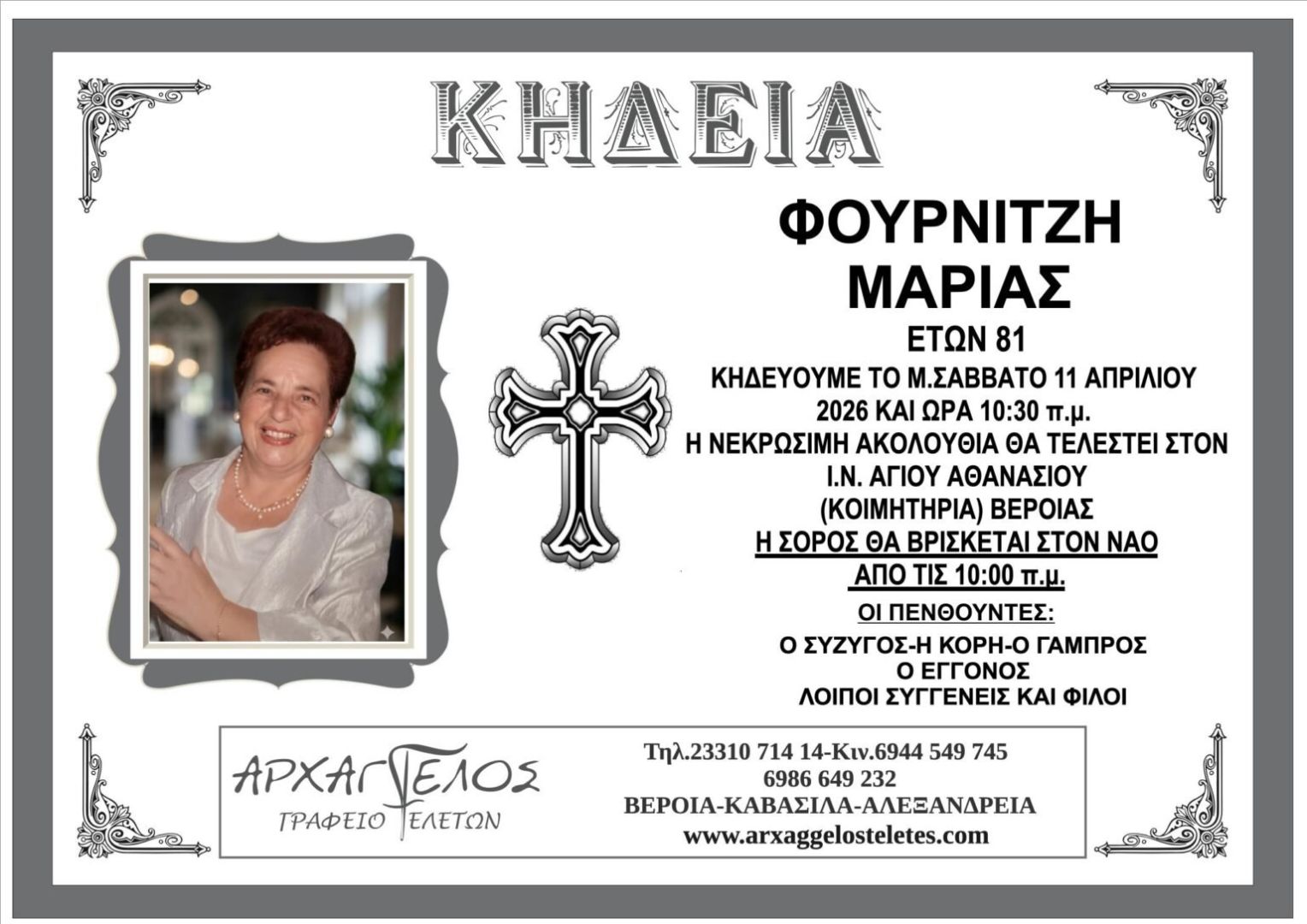 'Εφυγε από τη ζωή και κηδεύεται το Μ. Σάββατο 11 Απριλίου 2026 στις 10.30 π.μ. από τον Ιερό Ναό Αγίου Αθανασίου (Κοιμητήρια) Βέροιας η Μαρία Φουρνιτζή σε ηλικία 81 ετών.