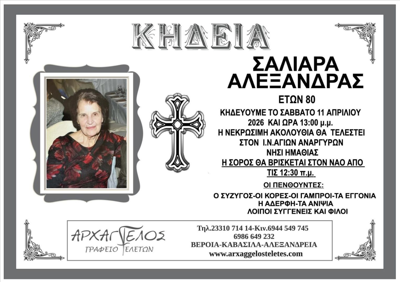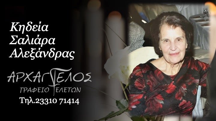 Έφυγε από τη ζωή και κηδεύεται το Σάββατο 11 Απριλίου 2026 στις 1.00 μ.μ. από τον Ιερό Ναό Αγίων Αναργύρων στο Νησί Ημαθίας η Αλεξάνδρα Σαλιάρα σε ηλικία 80 ετών.